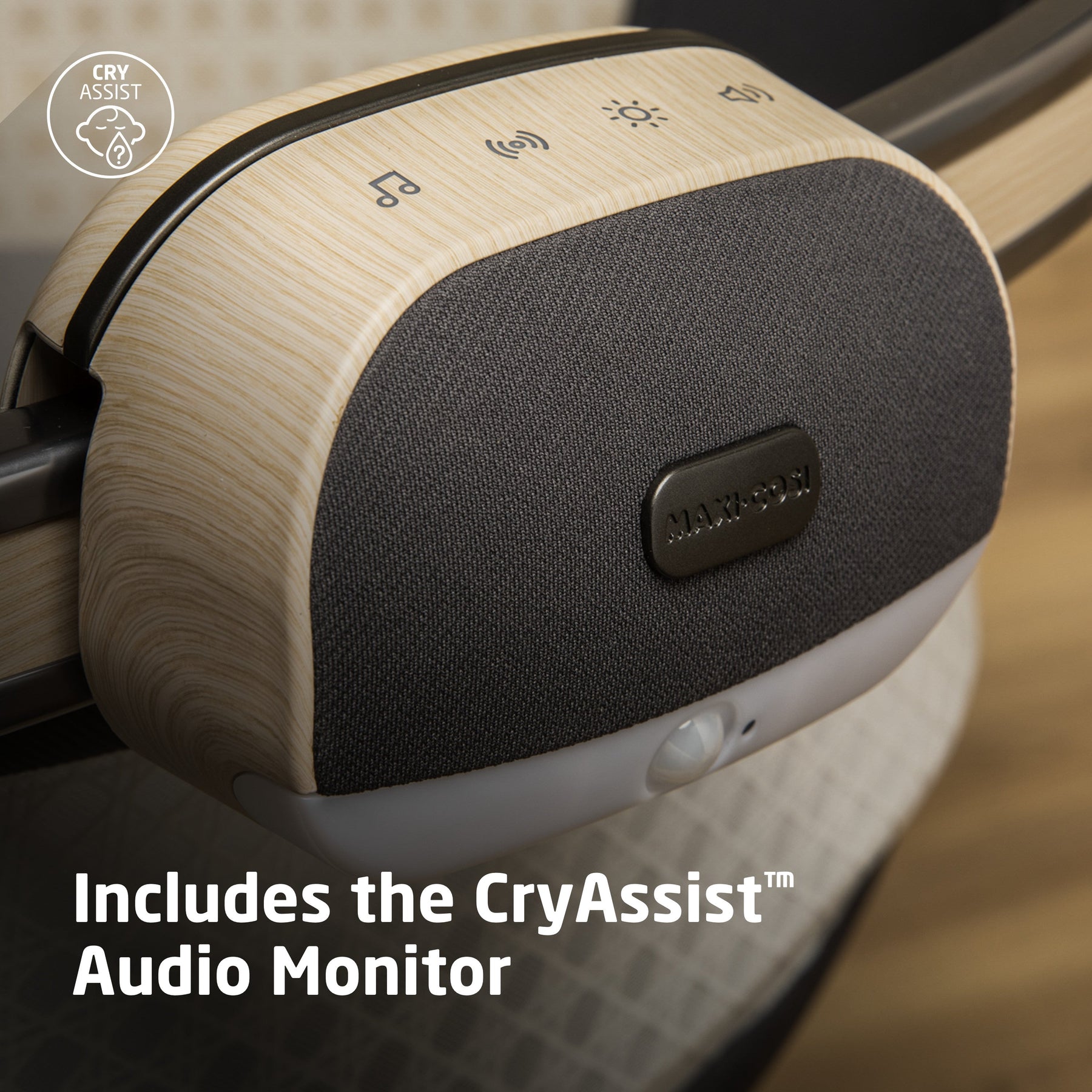 - Includes the Maxi-Cosi CryAssist™ Audio Monitor, which translates your little one’s cries and notifies you in the Connected Family app. Also features soothing sound playback, a motion-activated nightlight and gentle vibration