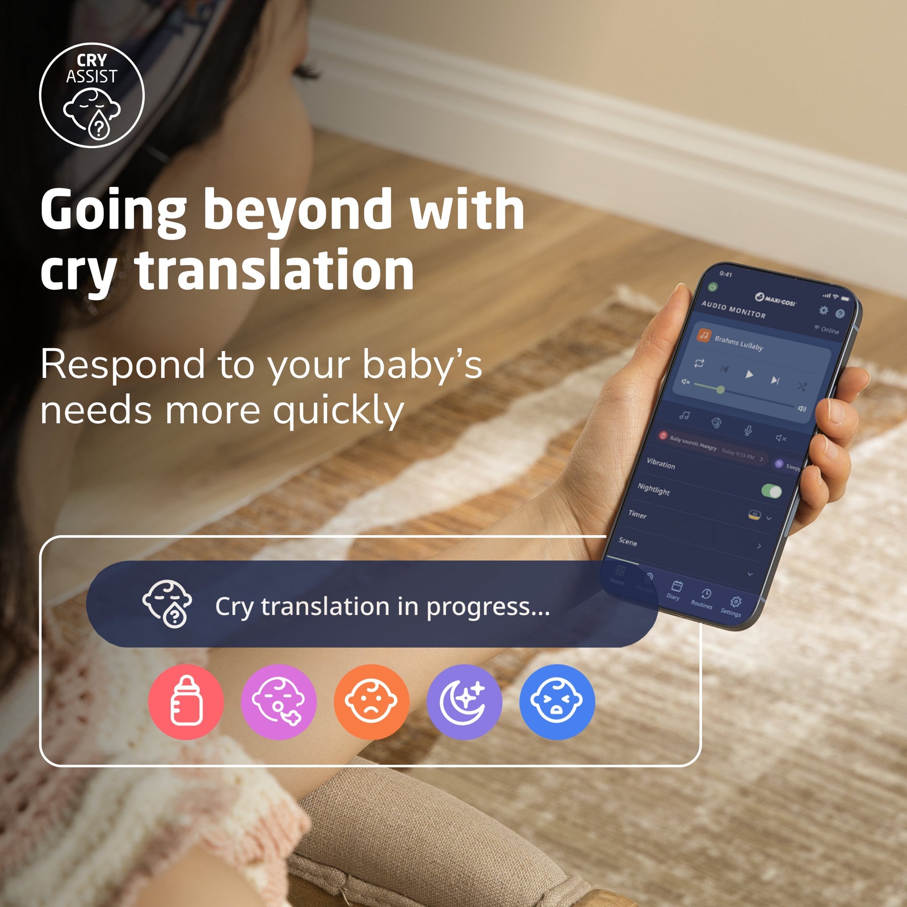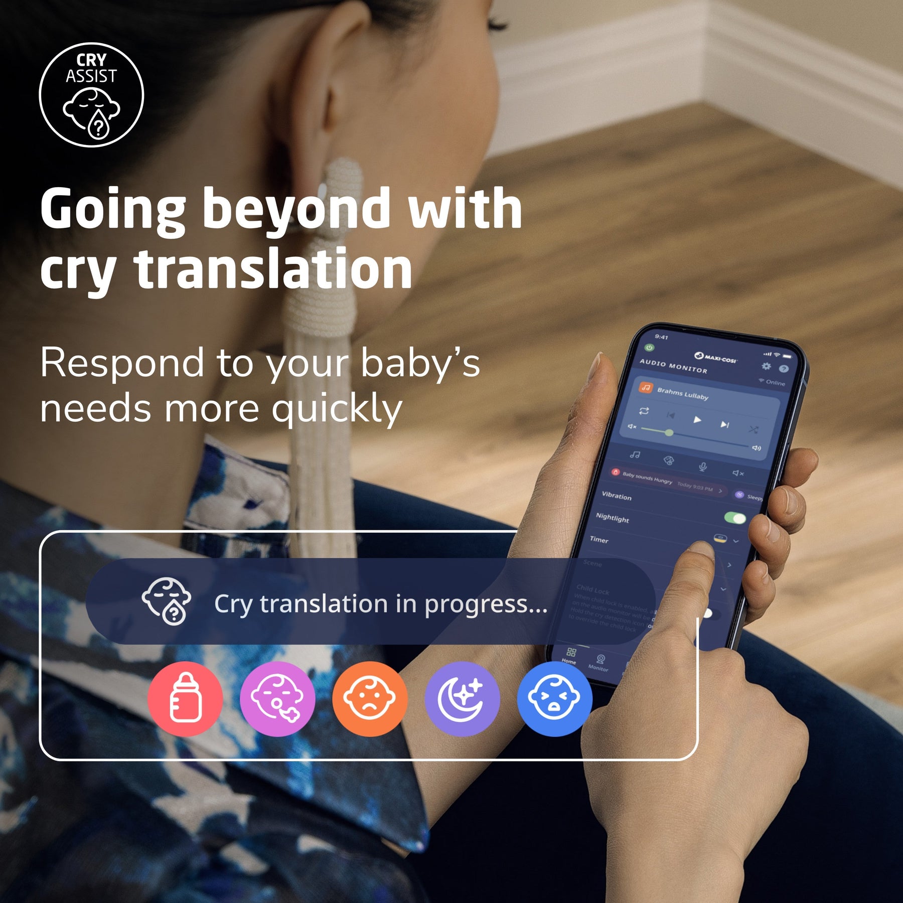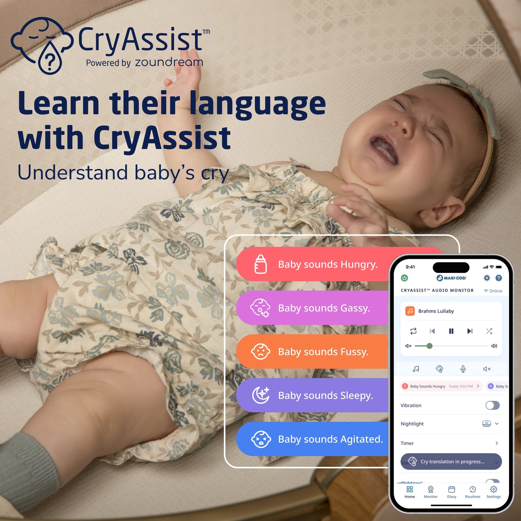 The included Maxi-Cosi Audio Monitor features CryAssist™, powered by Zoundream. Our groundbreaking CryAssist™ technology uses AI to translate your little one’s cries, letting you know if they might be sleepy, fussy, gassy, agitated, or hungry. Other baby monitors just detect a child’s cries––but by knowing what is bothering your baby, you’ll be able to respond to their needs quickly and with confidence. Your little one is communicating with you, and with CryAssist, now you’ll know what they’re saying. Each of CryAssist’s response-based features are optional, ensuring control is always in your hands. With cries and cry data kept anonymous and encrypted on our cloud, private moments are kept between you and baby.