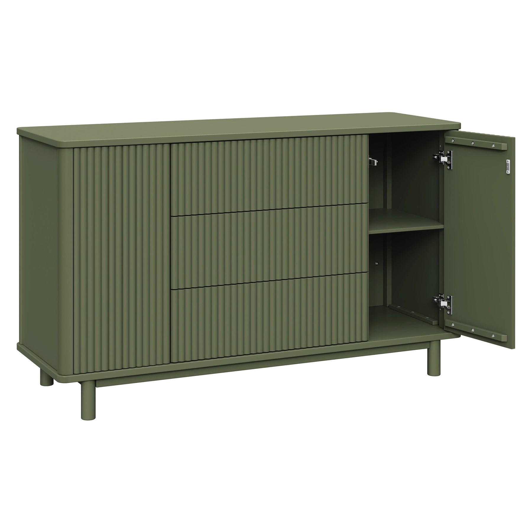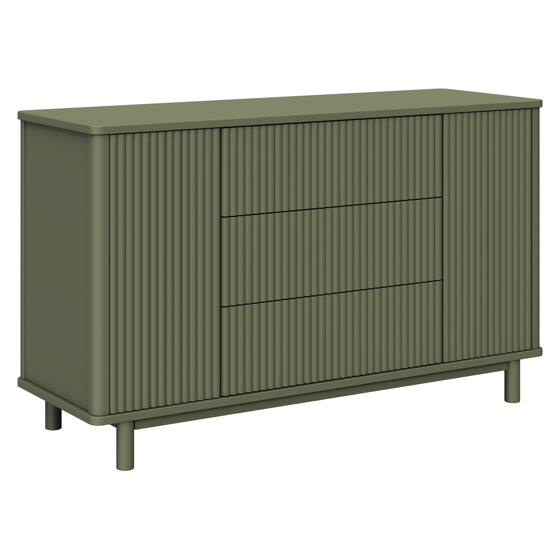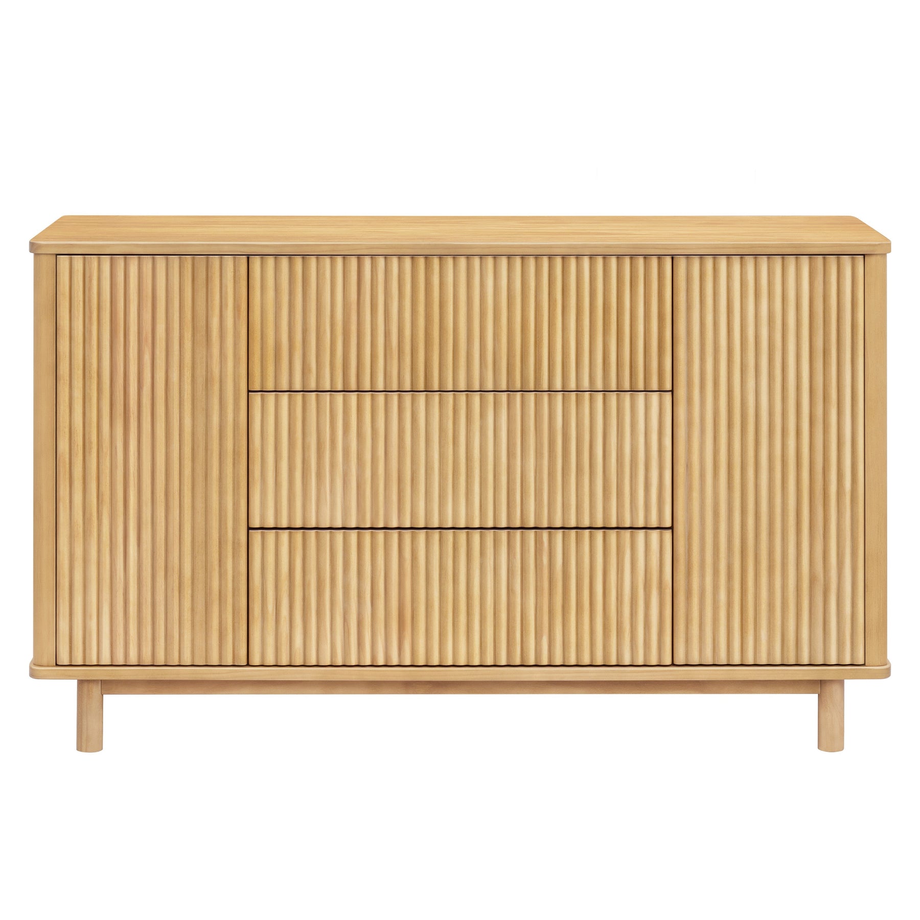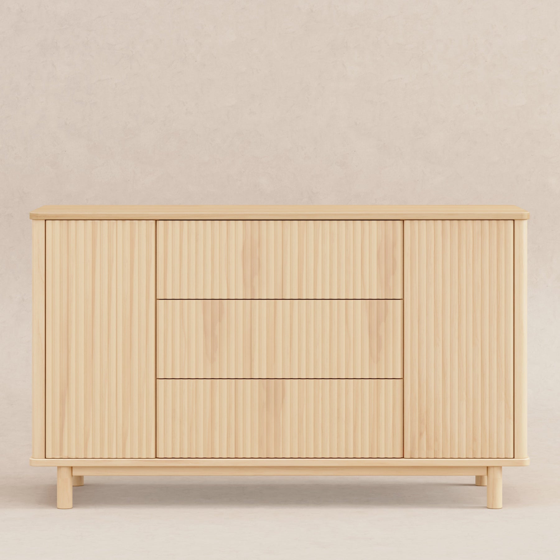 The timeless Pogo Tambour Assembled Dresser exudes modern elegance with its textured fluted tambour paneling, smooth, rounded edges, and elevated silhouette. Designed for the nursery but beautiful enough for use throughout the home, it features push to open smooth-gliding drawers, spacious side cabinets, included anti-tip kit for safety, and best-of-all, it arrives fully assembled, ready out of the box.