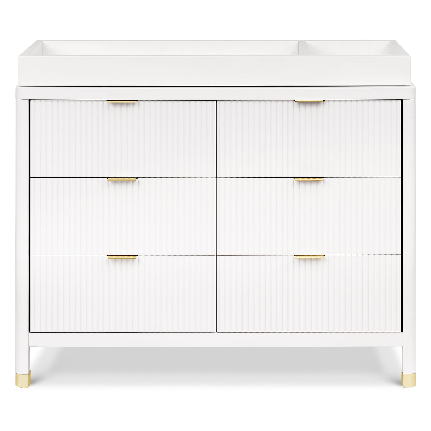 With its textured tambour design, elegant gold feet, and modern drawer pulls, the Brimsley Tambour Dresser was crafted for those who appreciate the perfect blend of sophistication and functionality. The dresser boasts 6 spacious drawers for clothing, blankets, and more. Transform your space with a statement piece that not only organizes but elevates the style of your room. Its versatility ensures that it will seamlessly transition from a nursery staple to a stylish piece in any room of your home.