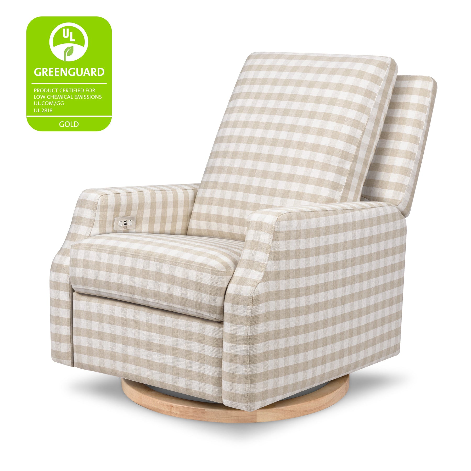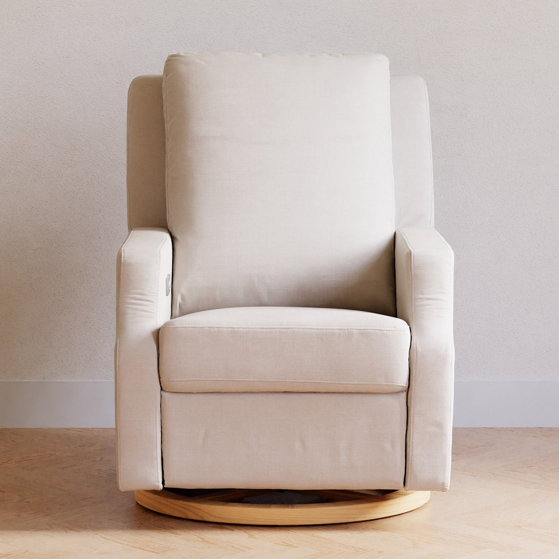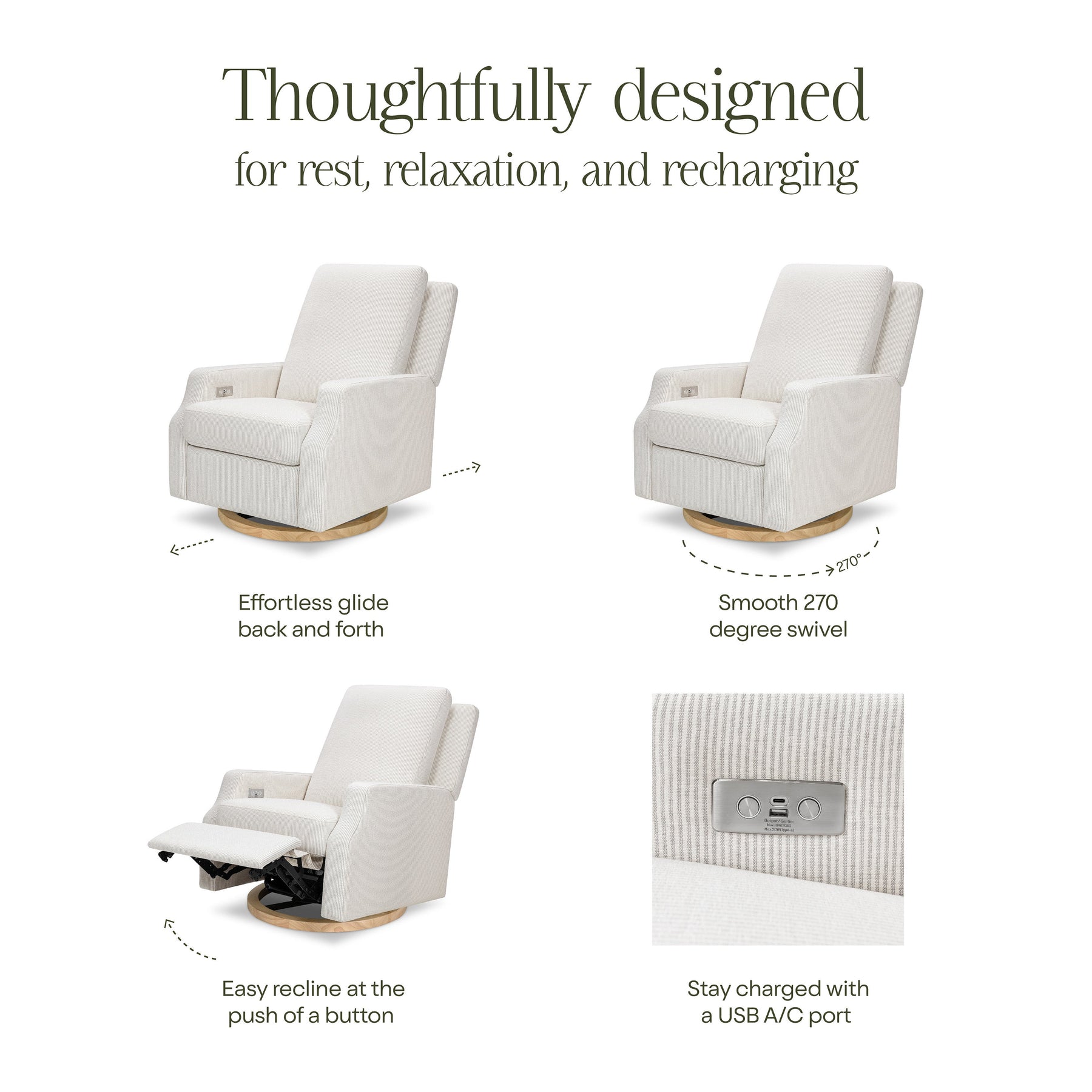 The Crewe Recliner blends form and function with its crisp, contemporary design and comfortable seat. Its smooth, back-and-forth gliding motion helps you rock your baby to sleep with ease, while the plush back cushion, electronic recline mechanism, and convenient swivel create an inviting repose for both you and your baby.