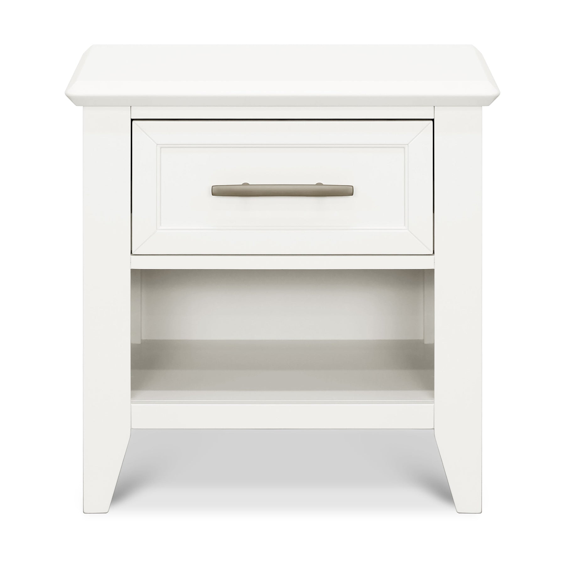 The Beckett Nightstand features the same simple tapered feet and contemporary 45 degree trimming to complement the Beckett 4-in-1 Crib and Beckett 6-Drawer Dresser. With its raised drawer panel molding and an open shelf for extra storage, the Beckett is a transitional piece fit for any setting. The dovetail construction drawer is fully extendable with self-closing, ball bearing glides.