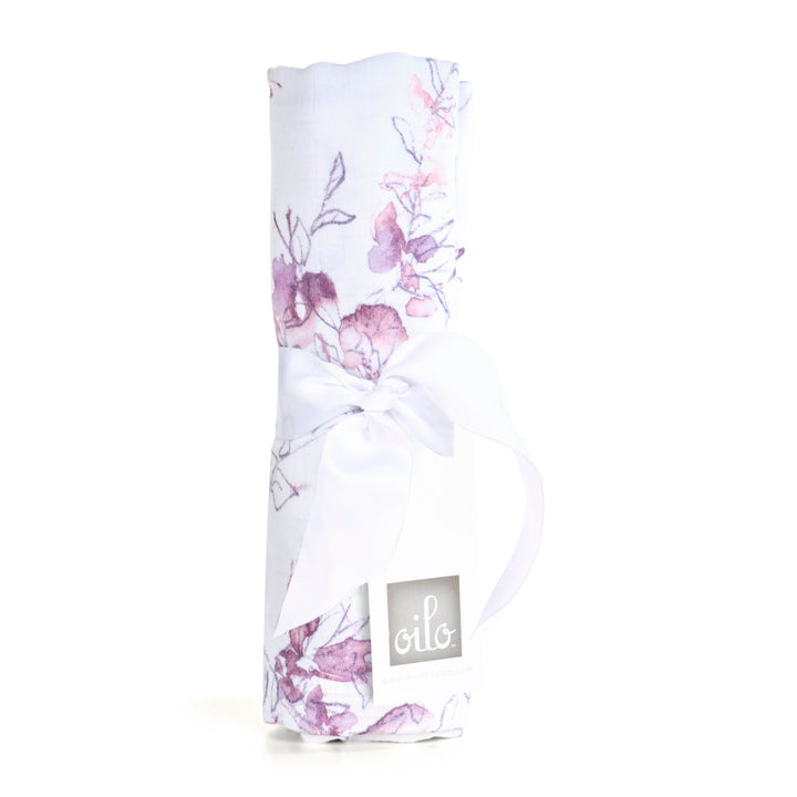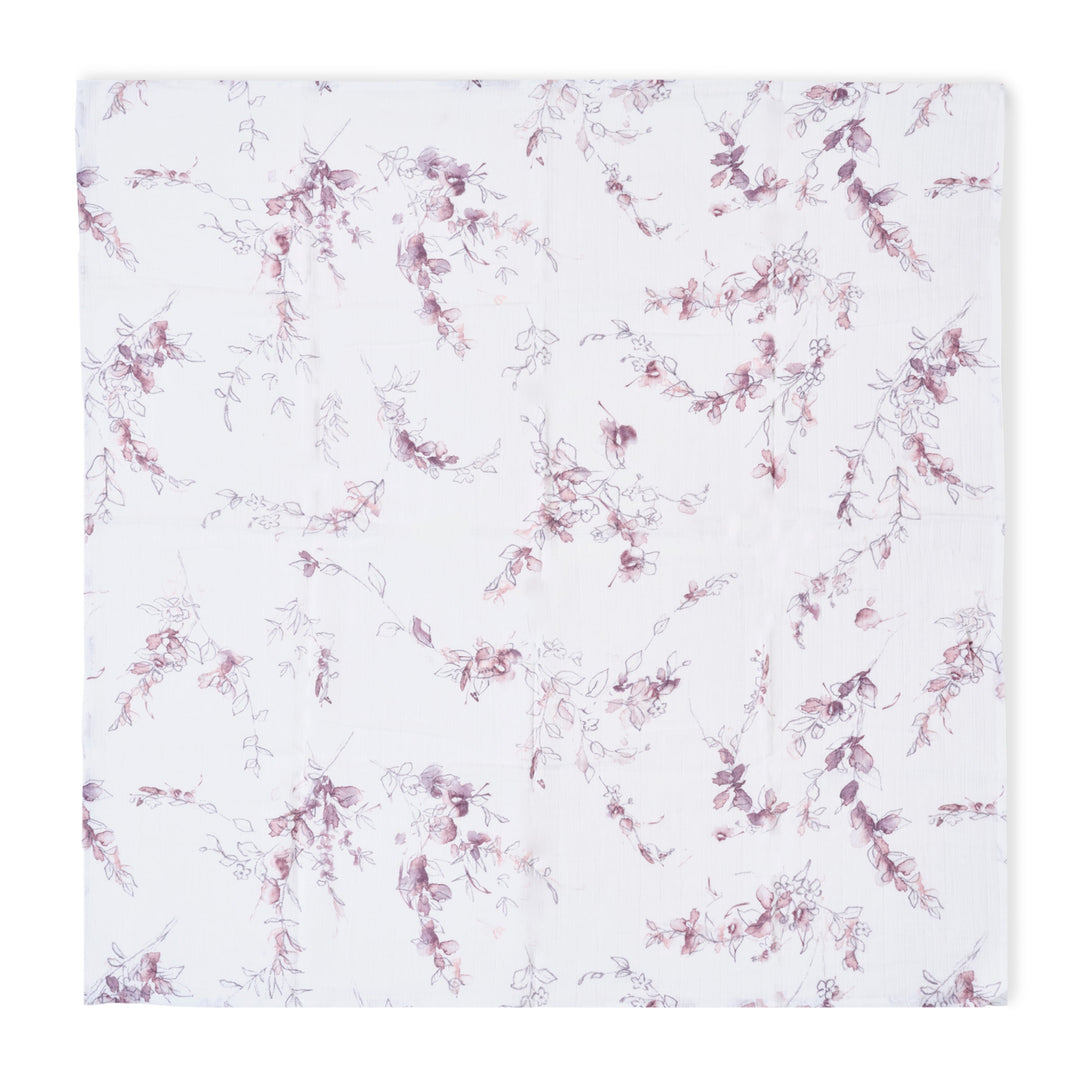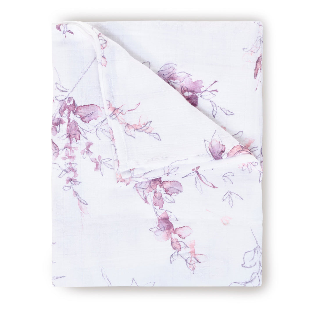 Crafted in lightweight and breathable cotton muslin, ideal for swaddling, nursing, cuddling and more. Our Bella Floral design features soft vines with leaves in a beautiful lavender toned watercolor style. It adds a touch of feminine whimsy to your baby's nursery!