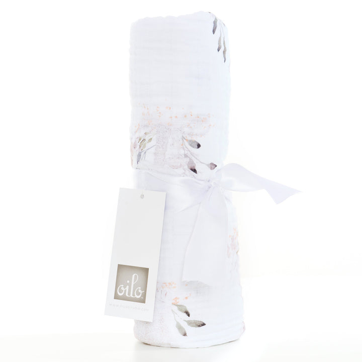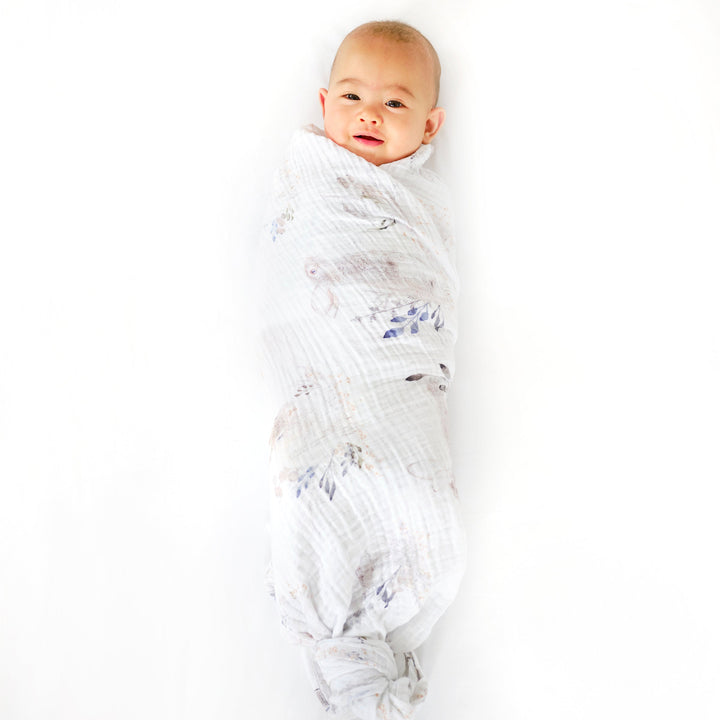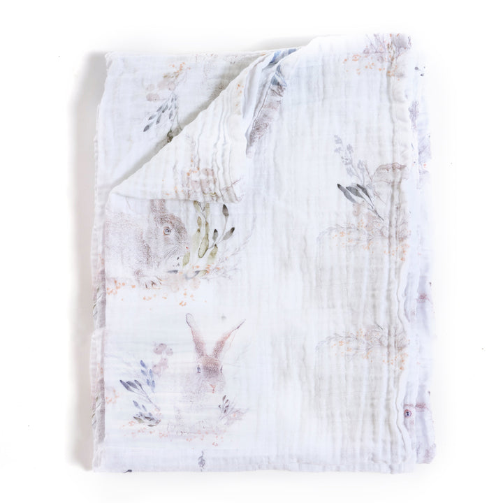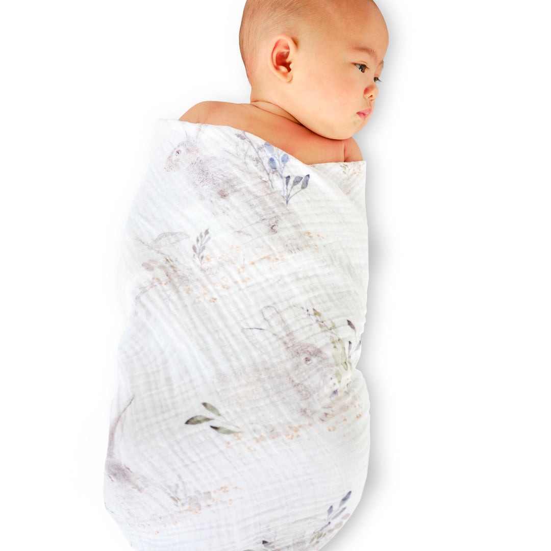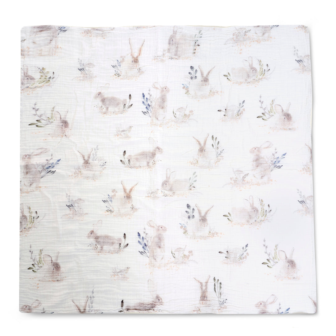 Crafted in lightweight and breathable cotton muslin, ideal for swaddling, nursing, cuddling and more. Our Cottontail bunny rabbit design features playful bunnies among flowers and leaves, in soft pastels and gray colors. Add a touch of imaginative whimsy to your baby's nursery!