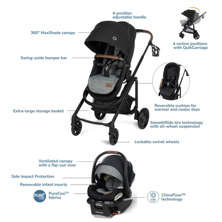 From quick strolls around the neighborhood, to running errands or exploring new places, the Tayla Max 5-in-1 Modular Travel System makes outings comfortable and easier than ever. This modular stroller and infant car seat combination offers multiple modes of use to carry your newborn through toddlerhood, upright or fully reclined, and facing you or the exciting world ahead of them. Parents love the stroller’s versatility and the ease of the unique QuikCarriage feature, which allows the upright stroller seat to convert to a lie-flat carriage, no pit stops needed to change positions for your little traveler. The Mico Luxe+ Infant Car Seat provides premium comfort with plush PureCosi fabrics and padding made without wool or added fire retardant treatment. Plus, the shell is designed with ClimaFlow technology for added ventilation to keep babies cooler, and the ventilated canopy allows increased airflow. The vegan-leather trim on the contoured handle adds style and provides a more comfortable carrying experience. In stroller mode, choose from 4 reclining positions to give your little one a relaxing ride. When you want added privacy or protection from the elements, extend the 360° MaxShade canopy with protective mesh over the entire seat. Tuck all you need for your excursions in the extra-large storage basket. All these features and more are cleverly designed into the lightweight frame with SmoothRide tire technology for nimble maneuvering, and 4 handle positions for a more comfortable push. With the Tayla Max, you’re ready to adventure in every direction.