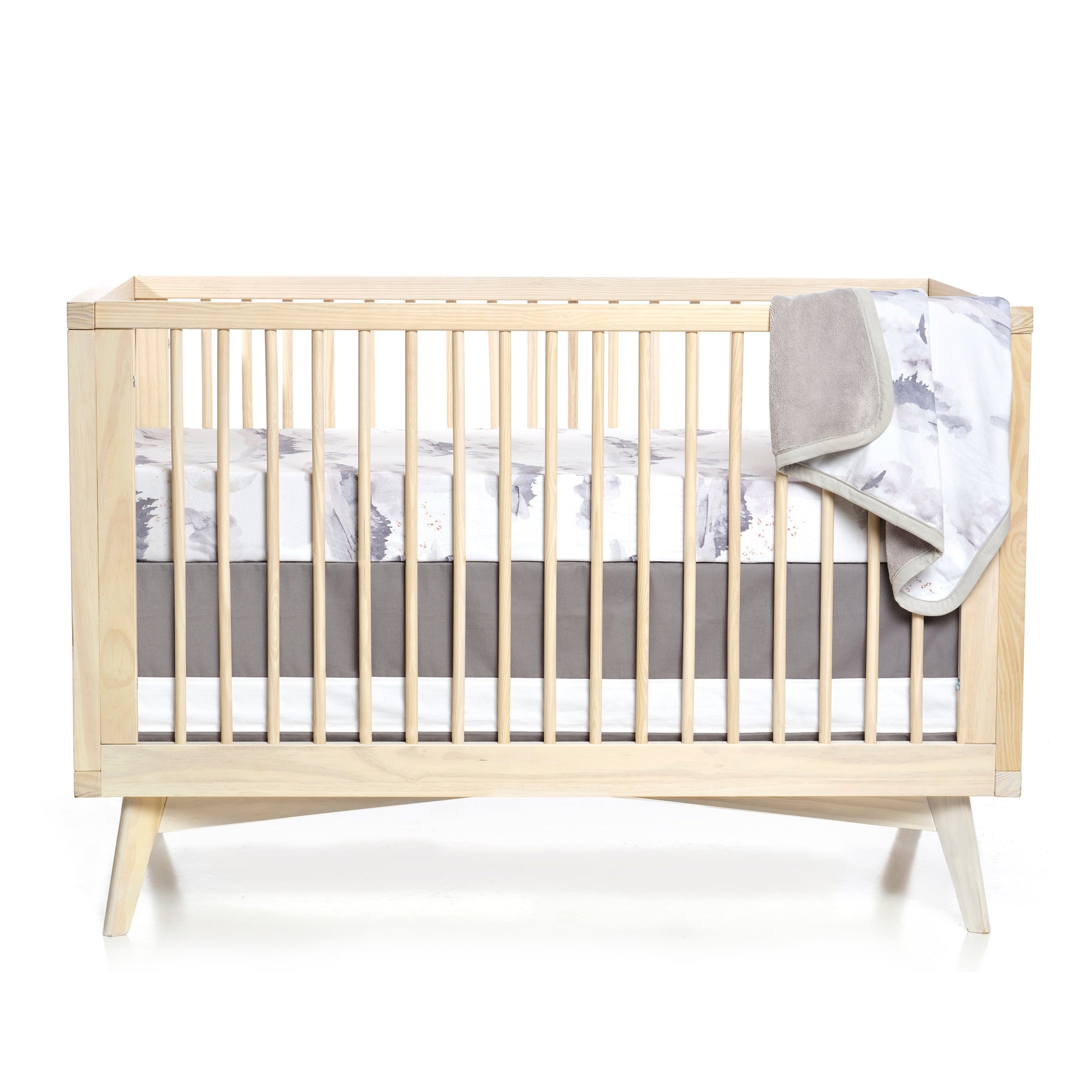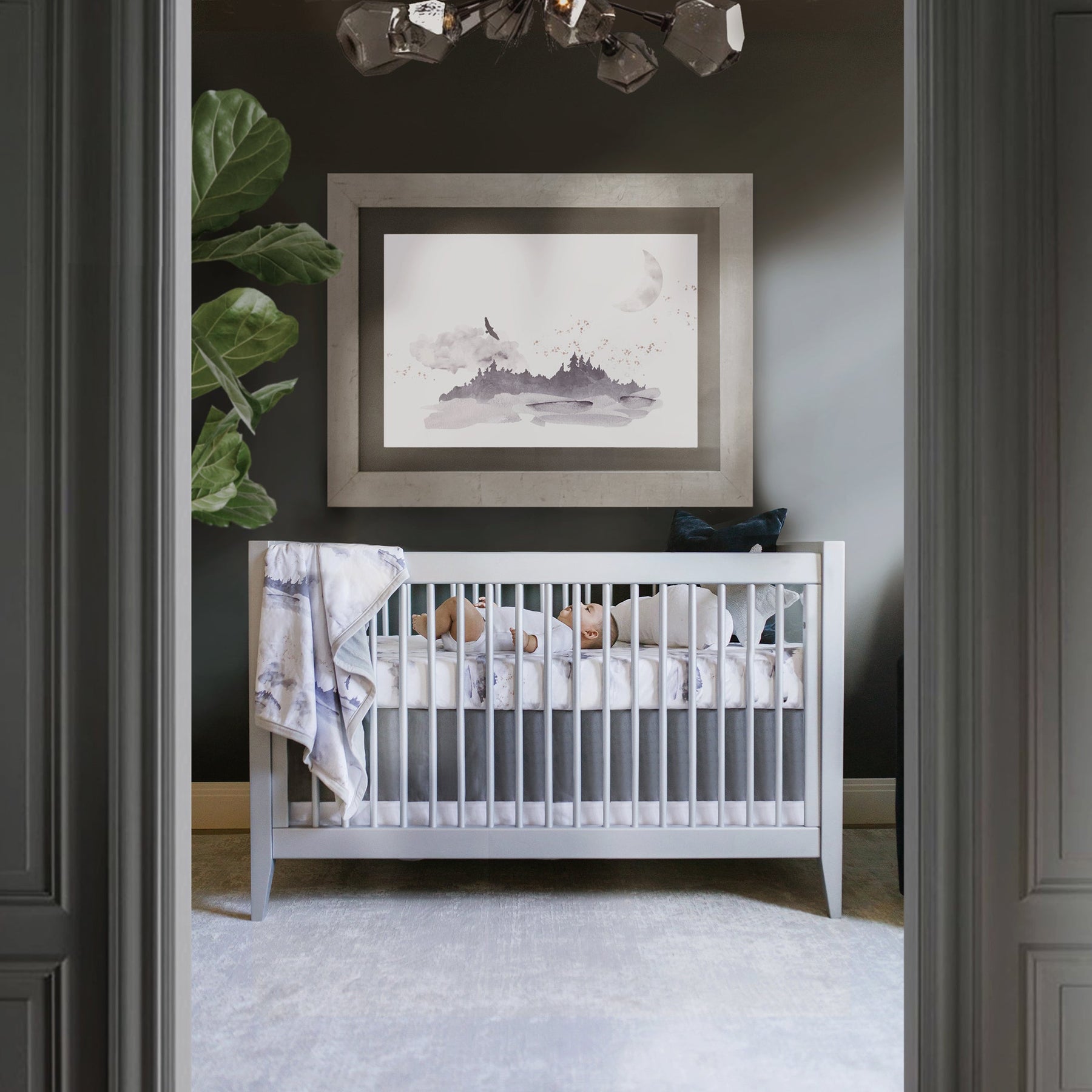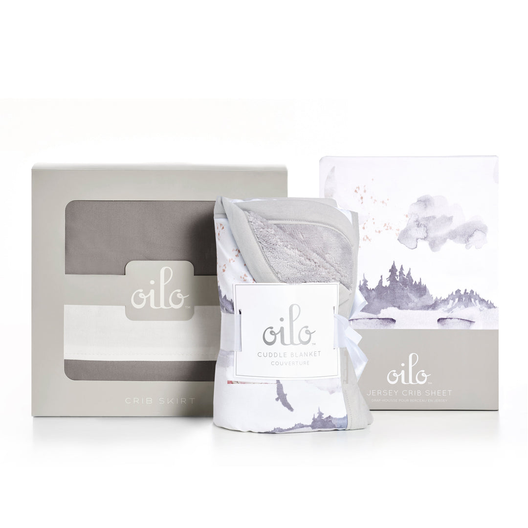Drape your baby in plush luxury with Oilo’s Cuddle Blanket. Our Misty Mountain design features a mountain scene with a crescent moon, painted in a gray and white watercolor style. It adds a touch of imaginative whimsy to your baby's nursery!