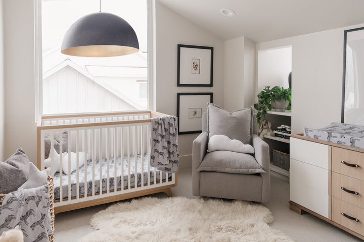 Our Zebra design features soft gray background with black zebras. It adds a touch of playful imagination to your baby's nursery.